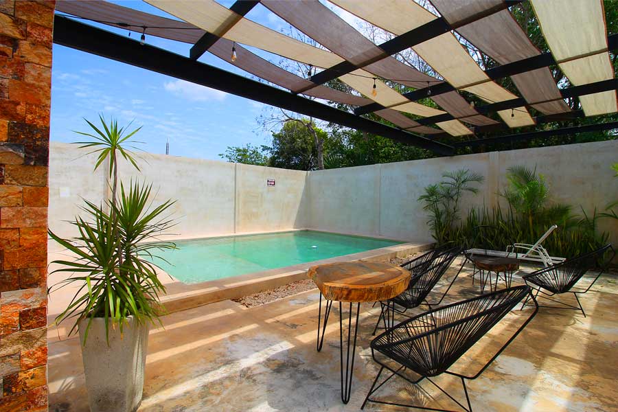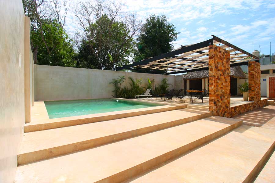 Equipada con alberca, camastros, palapa y área de comedor